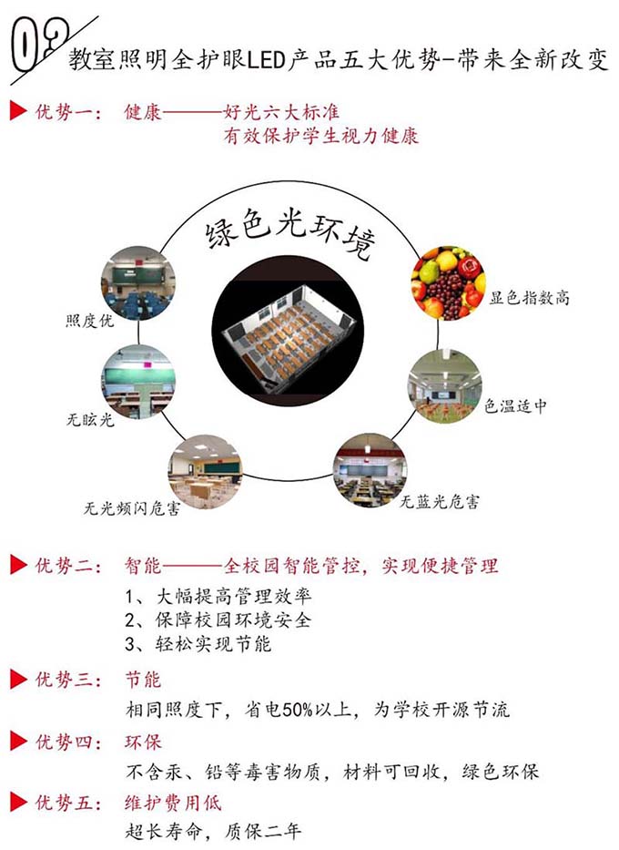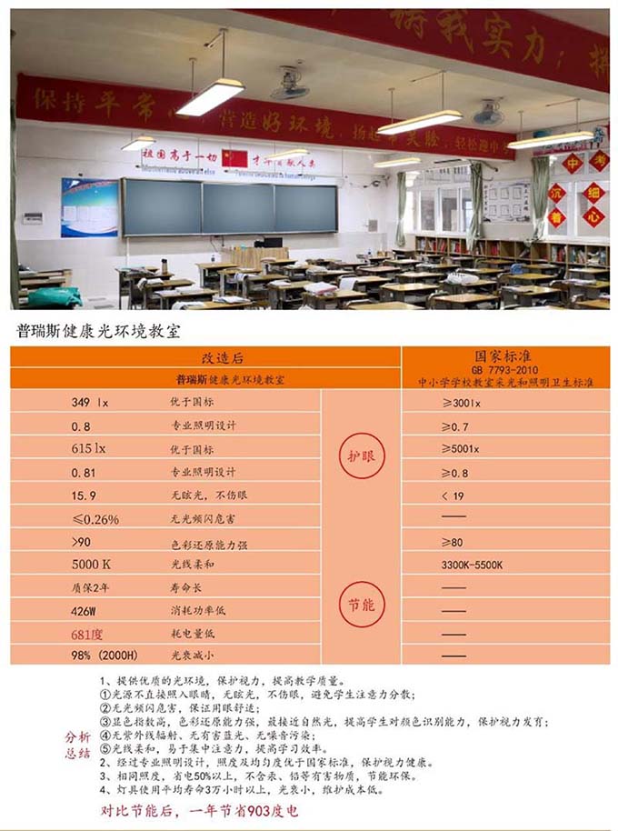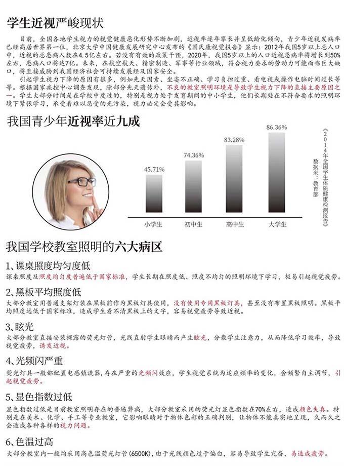 教室(shi)燈(deng)的(de)燈(deng)光(guang)顏色更加真實,不刺眼(yan),學(xue)生(sheng)眼(yan)睛很舒適,疲勞(lao)度低(di),不會(hui)因為眼(yan)睛疲勞(lao)而產生(sheng)厭(yan)學(xue)心理,降低(di)近視率。