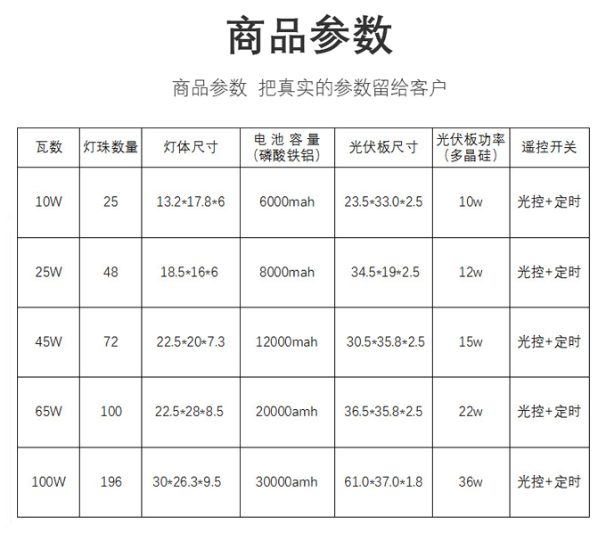 - 產品(pin)簡(jian)介:產品特(te)點: 1.進口LED芯(xin)片,光通量(liang)(liang)超(chao)過330LM,使用(yong)壽(shou)命(ming)真正(zheng)能做夠達30000小(xiao)時(shi),壽(shou)命(ming)保(bao)證(zheng) 2.A級多晶硅太(tai)陽能板充電(dian)快(kuai),光電(dian)轉化高度20%,僅需5個(ge)小(xiao)時(shi)可(ke)以(yi)(yi)達到滿電(dian)狀態(tai)光轉換高大17%堅固耐用(yong),使用(yong)壽(shou)命(ming)可(ke)達15年 3.環保(bao)鋁(lv)電(dian)池優質A品電(dian)芯(xin),容量(liang)(liang)高,內(nei)阻低(di),可(ke)以(yi)(yi)最大電(dian)流放(fang)電(dian),穩定性(xing)強,循環使用(yong)壽(shou)命(ming)長(chang),可(ke)以(yi)(yi)連續沖放(fang)電(dian)1000次,電(dian)池容量(liang)(liang)不低(di)于(yu)額(e)定容量(liang)(liang)的85% 4.太(tai)陽能燈專(zhuan)用(yong)延長(chang)線,耐拉、抗(kang)彎曲、防斷裂導電(dian)率高、低(di)電(dian)阻、低(di)損耗、抗(kang)老化