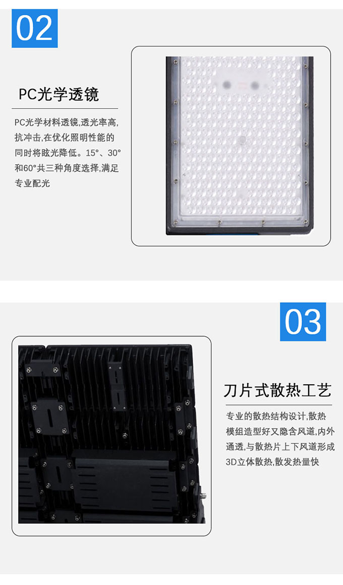 - 產品簡介(jie):產品(pin)特(te)點(dian): 1、鋁材(cai)成(cheng)型(xing):釆(bian)用(yong)一體(ti)成(cheng)型(xing)壓鑄工藝, 精密塑(su)性,散(san)(san)熱(re)(re)面積(ji)大, 導熱(re)(re)性能好。 2、PC光學(xue)(xue)透(tou)鏡:PC光學(xue)(xue)材(cai)料透(tou)鏡,透(tou)光率(lv)高, 抗沖擊,在優化照明性能的 同(tong)時(shi)將眩光降低。15°、30° 和(he)60°共三種角度(du)選擇,滿足 專(zhuan)業配(pei)光。 3、刀片式散(san)(san)熱(re)(re)工藝:專(zhuan)業的散(san)(san)熱(re)(re)結構設計(ji),散(san)(san)熱(re)(re) 模組造(zao)型(xing)好又隱含風道,內外 通透(tou),與散(san)(san)熱(re)(re)片上下(xia)風道形(xing)成(cheng) 3D立體(ti)散(san)(san)熱(re)(re),散(san)(san)發熱(re)(re)量快