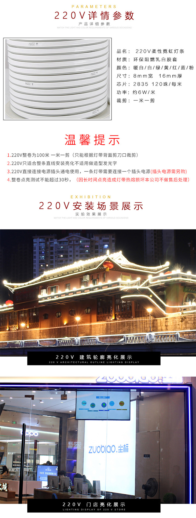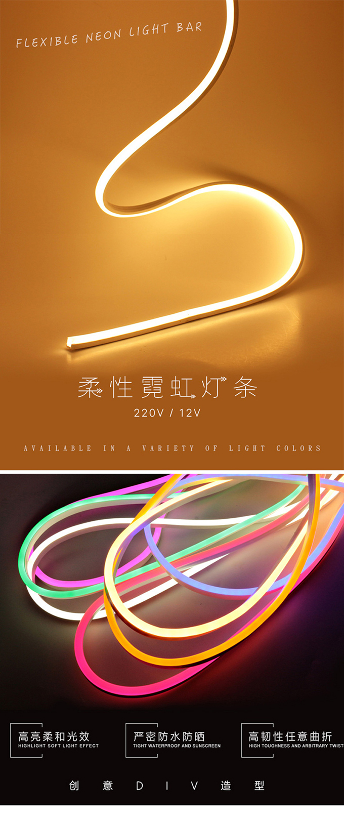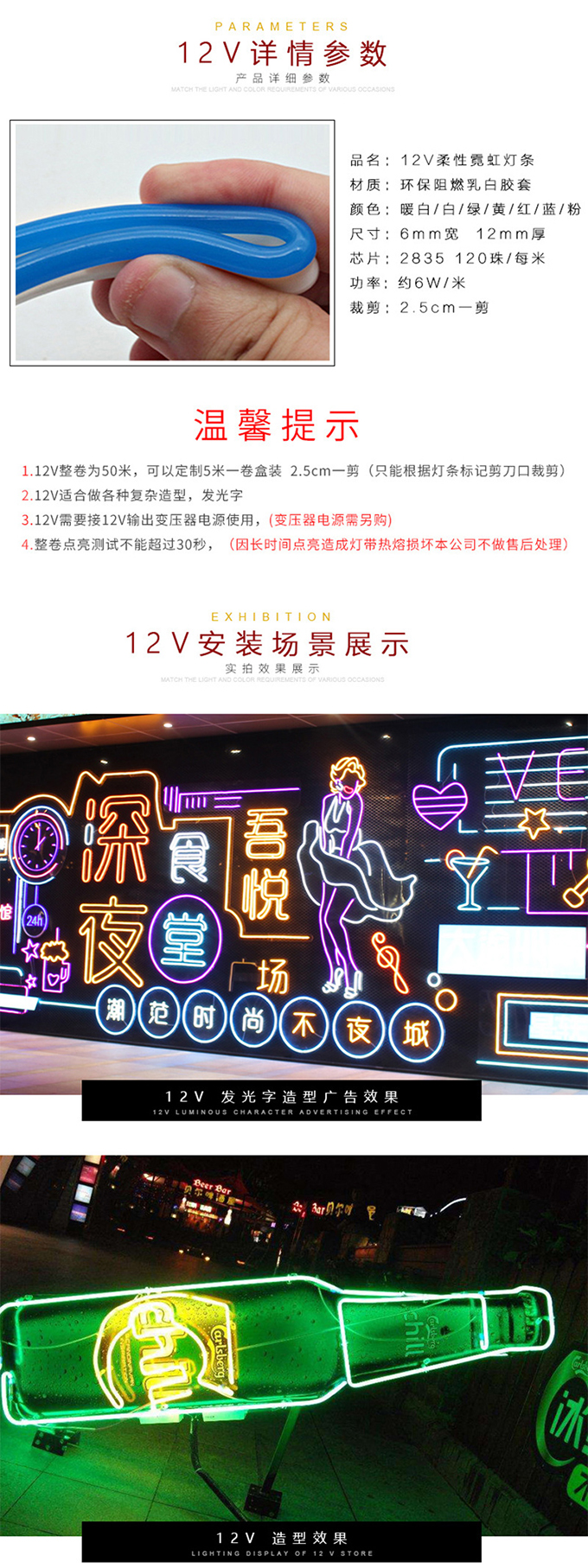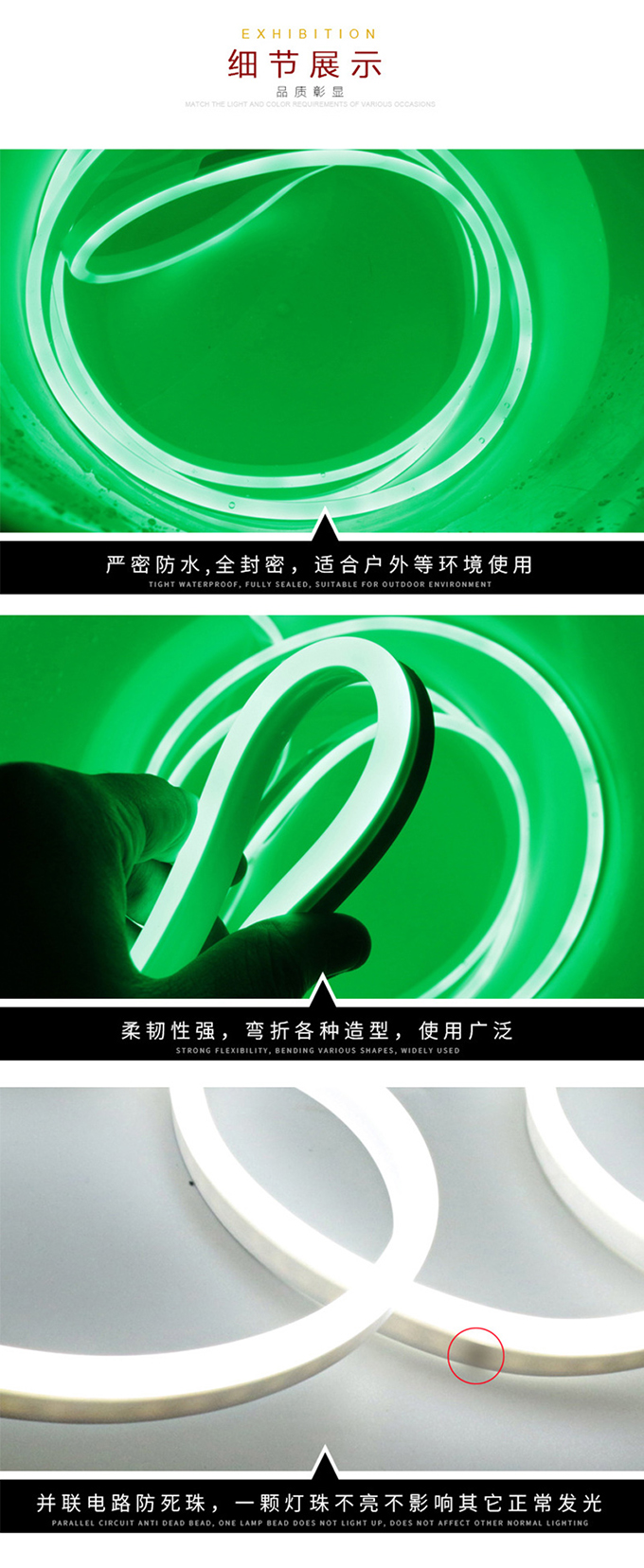 - 產品簡介(jie):1、節能:柔性通體燈(deng)帶可節能80%以(yi)上的能源(yuan)耗電使用(yong)成(cheng)(cheng)本耗電小, 因其光源(yuan)為(wei)LED。 2、柔軟(ruan):可承受擠壓(ya),采(cai)用(yong)材質(zhi)為(wei)環保型(xing)PVC材質(zhi),不但安裝簡單、 方(fang)便,而且亮(liang)度比(bi)過(guo)(guo)去(qu)的玻璃(li)(li)霓虹(hong)燈(deng)的亮(liang)度相比(bi)效果更為(wei)顯著,柔性通 體LED燈(deng)帶,它最高可以(yi)達到360度彎曲(qu),所(suo)以(yi)要彎曲(qu)成(cheng)(cheng)各種(zhong)文字,圖(tu) 形是(shi)非常容易。 3、長壽(shou)耐用(yong):這種(zhong)新型(xing)LED燈(deng)帶的推(tui)出,要比(bi)過(guo)(guo)去(qu)用(yong)的玻璃(li)(li)管霓虹(hong) 燈(deng)壽(shou)命(ming)長達30000小時。