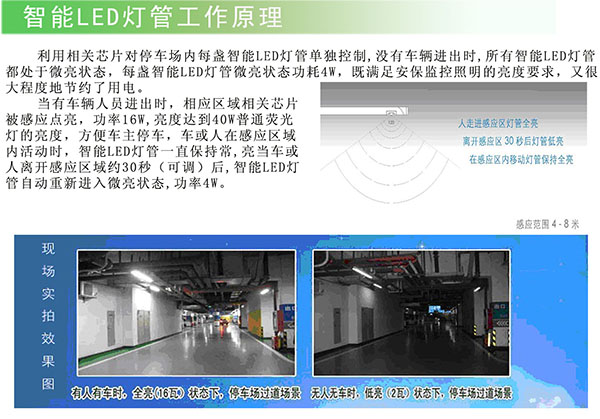 在資源短缺、節能環保的主形勢下,智能LED燈管可感控光照強度,減少無謂的電力消耗,是高用電量地下車庫照明的最佳選擇。
