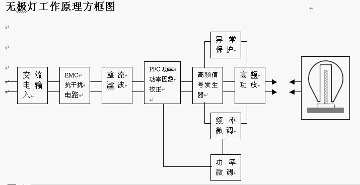 無極燈在結構上大致由三部分組成,高頻電子鎮流器,功率耦合器(內耦合,2.65MHZ)和涂有稀土熒光粉的玻璃泡殼(可以是多種形狀,大家見過圓球型的,方形的,等等)。無極燈鎮流器在市電(50HZ)的作用下,產生一個2.65MHz高頻正弦電壓,并同時產生一個3000V左右的點火電壓,通過功率耦合器在涂有稀土熒光粉的玻璃泡殼內瞬間建立一個高頻磁場,高頻磁場又同時產生高頻交變電場,導致泡殼內部的惰性氣體(氪氣和氬氣的混合氣體)發生電離并進而產生雪崩效應(應該是大學物理有講,半導體那一章,齊那擊穿和雪崩擊穿), 產生大量的紫外線輻射.熒光粉在紫外線作用下產生可見光.